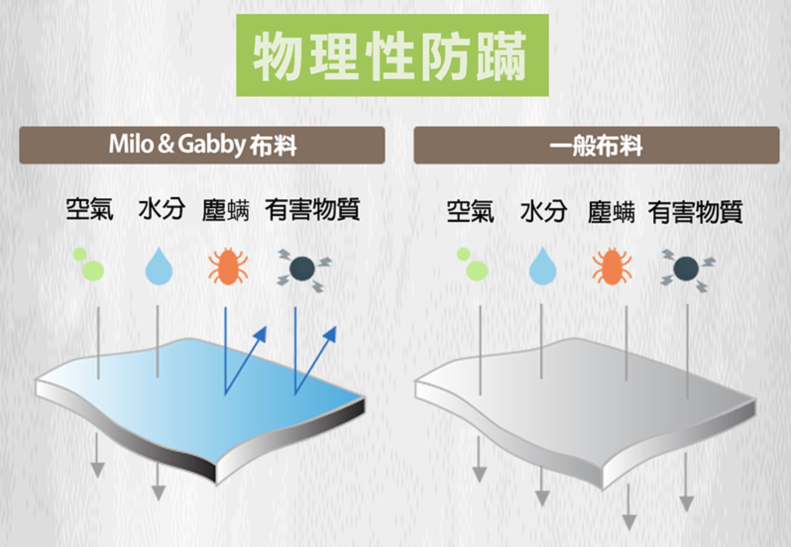枕心表布使用超細纖維,極細的織法,僅讓水分與空氣可以流通,塵蟎完全無法通過,以物理性的方式達到防蟎抗敏的效果。