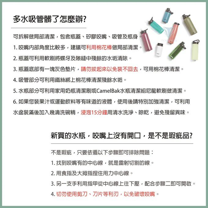 清洗時咬嘴、吸管、瓶蓋及瓶身皆可拆下分別清潔