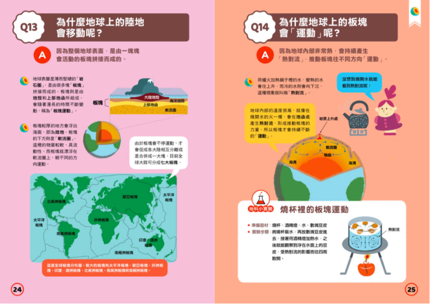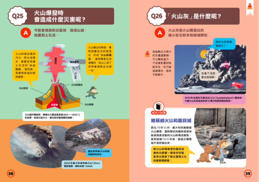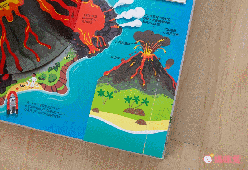 不僅僅用畫面讓孩子的認知大增加,還有關於火山的形成、區域分布、和成分等等,都有從小翻頁裡可以理解唷!