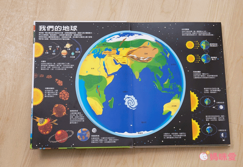首先翻開就先看到超大翻頁、不同面向的地球!這本書的最大特色是透過精緻的插圖、立體機關和拉頁設計,把地球的形成、板塊漂移、火山噴發、生物的演化和大滅絕、氣候和自然現象等,用一眼就了解的圖形和超過45個小機關,讓孩子邊玩邊認識地球!