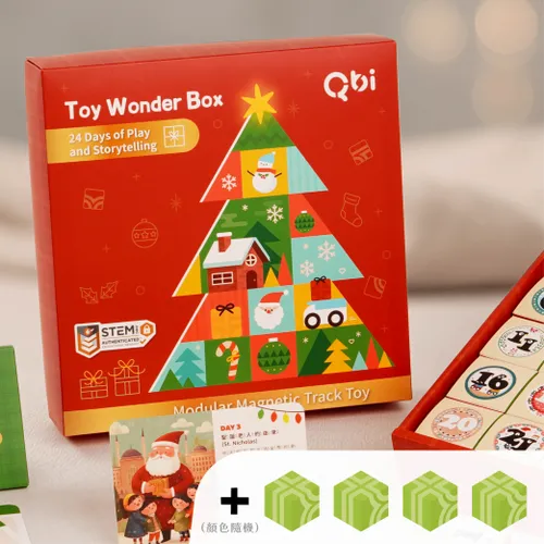 內容物:Qbi聖誕玩具驚喜盒(26pcs)+繽紛方塊擴充包(4pcs、顏色隨機),共30pcs、繽紛方塊12、彈跳橋3、斜坡6、超市1、迴力小貨車1、磁吸卡3、24張互動遊戲卡(聖誕故事+STEAM挑戰卡)。