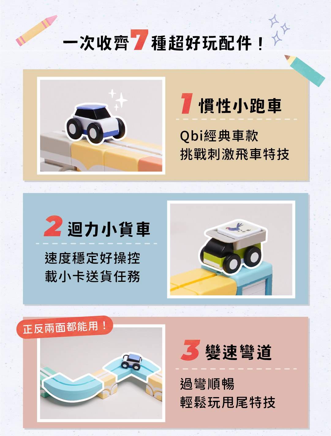 這次軌道也跳脫人以往對Qbi方方正正的印象,。變速彎道雙面皆有不同功能,正面採用特殊傾斜設計,讓車子過彎時暢行無阻!背面則有減速的功能,有一種真實降速坡的感覺呢~另外還有變速斜坡,同樣有正反兩面功能,正面為平滑面,能讓車子加速!反面則是凹凸設計,讓車子達到減速的效果!