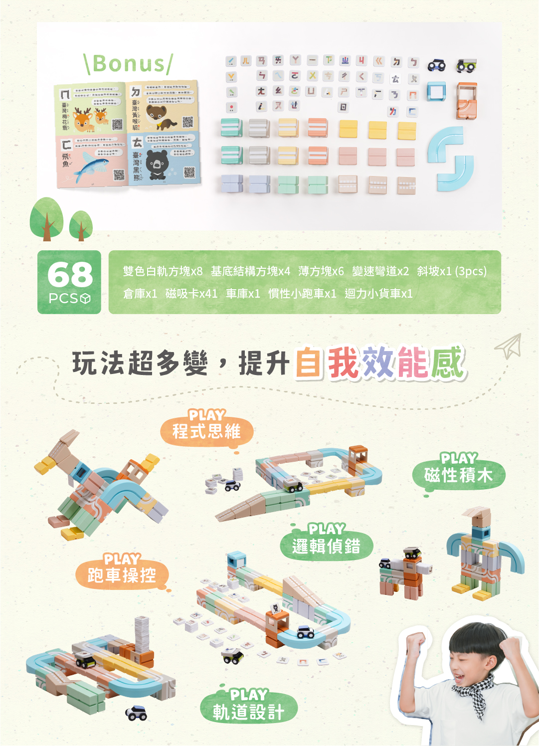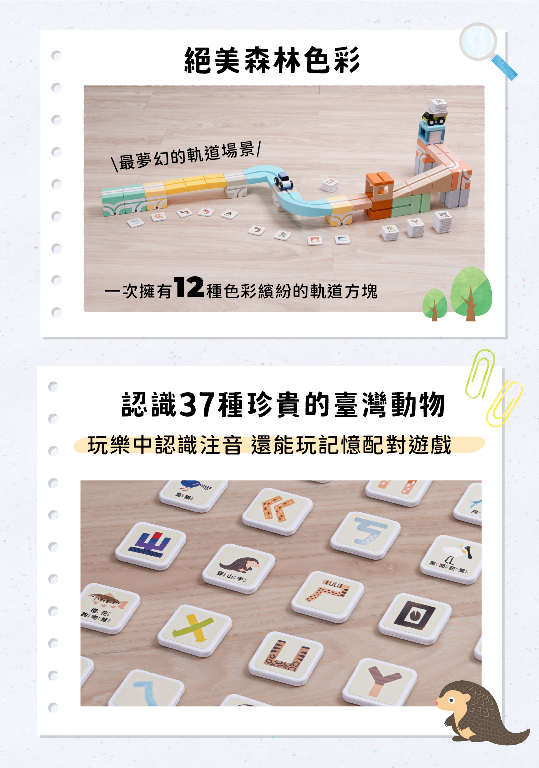 超豐富68pcs,夢幻的配色x臺灣動物x2種人氣車款(慣性小跑車、迴力小貨車)打造百變好玩軌道🔥從玩樂中學習ㄅㄆㄇ注音符號,每個注音都能跟動物配對,好玩又兼具教育意義!