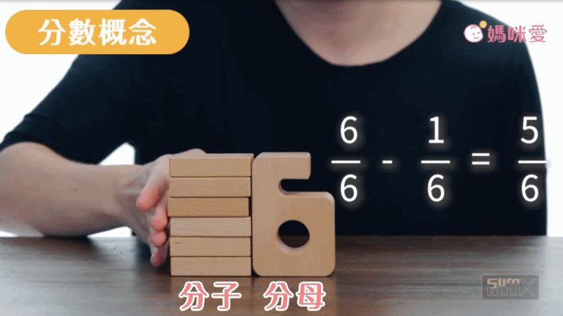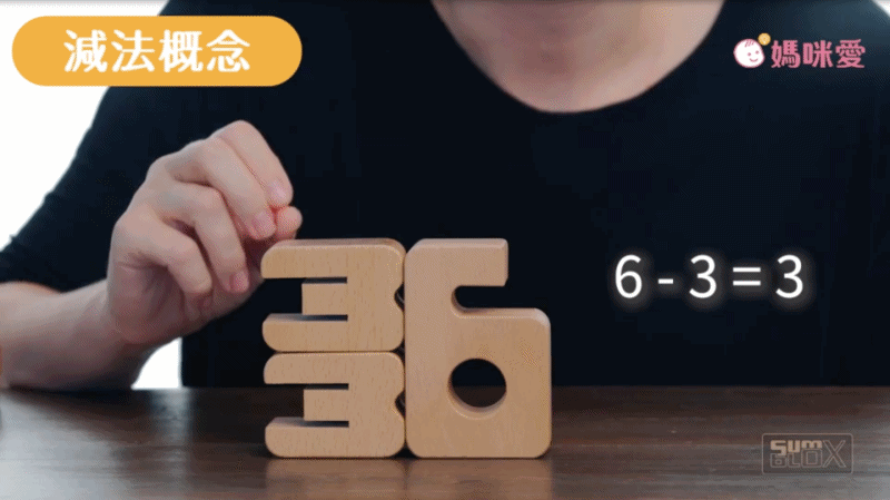 先疊出 3+3 與數字 6 的等高積木堆,然後拿掉一個數字 3 的積木,剩下一個 3 的積木啦!減法的概念輕鬆明白!