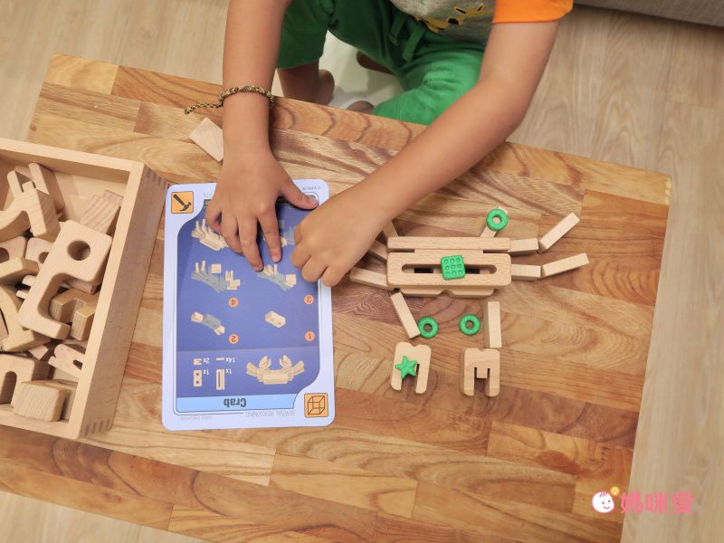 P將很喜歡把積木拼成喜歡的動物,還拿了自己的玩具來當作螃蟹的嘴巴和眼睛