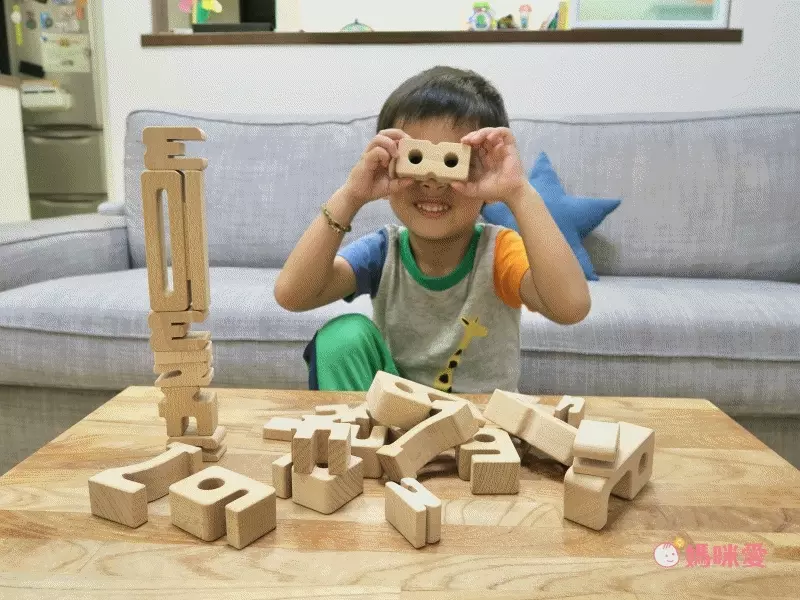 他發現數字 8 就像是望遠鏡,興奮地拿起來看來看去。一組積木的玩法真的非常多變呢