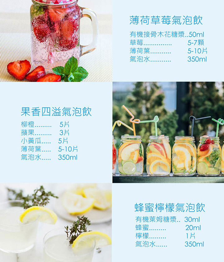 除了直接喝之外,也可以自己加入水果、果醬、蜂蜜等等,創造出屬於自家的夏日飲品,原料和糖量都能自己控制,比起外面的飲料真的相對健康千百倍!