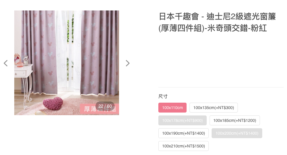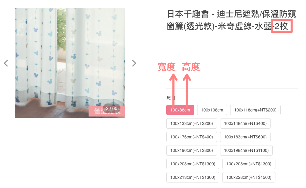選好喜歡的花色後,會看到如下圖有非常多尺寸可以選擇~這裡的「尺寸」指的是「單邊窗簾完全攤平的寬度」,而每個選項都統一是寬度x高度,例如 100x88cm 就是指寬度100cm、高度88cm,以此類推。而由於一般窗簾都會以雙邊 2 的倍數販售(畢竟左右都要有窗簾嘛),所以上面的「2枚」指的就是一組一扇窗的雙邊窗簾。