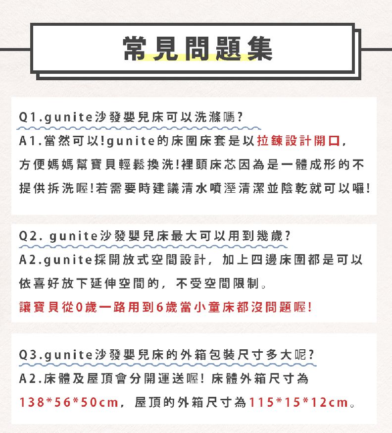 gunite 安心沙發嬰兒床 ,考量了「使用安全、親子親密關係、長期使用」三大需求,設計出嶄新的「落地式嬰兒床」,不但聰明的解決了寶貝半夜從床上摔落的危機,還延長了12倍嬰兒床的使用期限,嬰兒床同時能當「嬰兒護欄、地墊、遊戲墊」讓寶貝從0歲使用到6歲!是不是聽起來很心動呀~~買一件商品,抵三件呢!現在下單沙發嬰兒床,就送 Dollbao - 小香風陶瓷食物剪哦!心動的媽咪把握機會~~