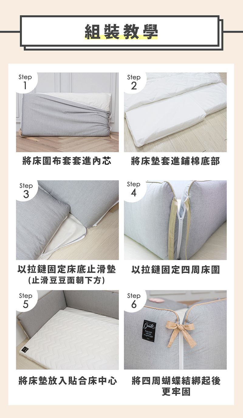 雖僅有7公斤輕巧好搬移~但是床圍在組合的過程主要是利用台灣YKK拉鍊連接彼此,最後還有蝴蝶結綁起,美觀又堅固!