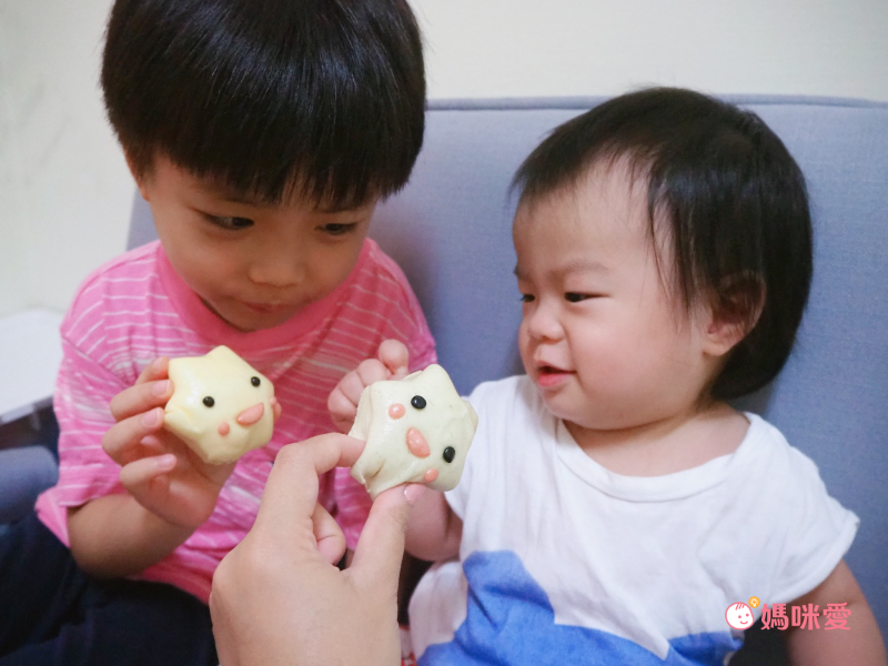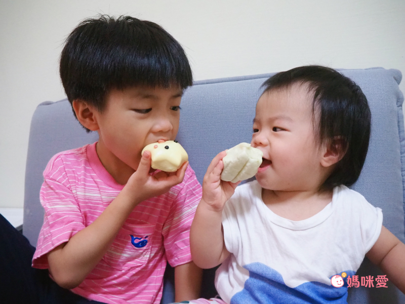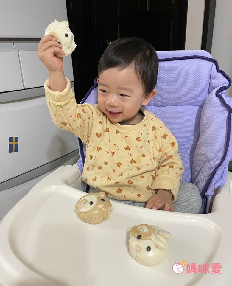 弟弟吃的則是沒有包餡的中秋造型饅頭(雖然已被孩子毀容XD),和哥哥一起享用美味的早餐唷~