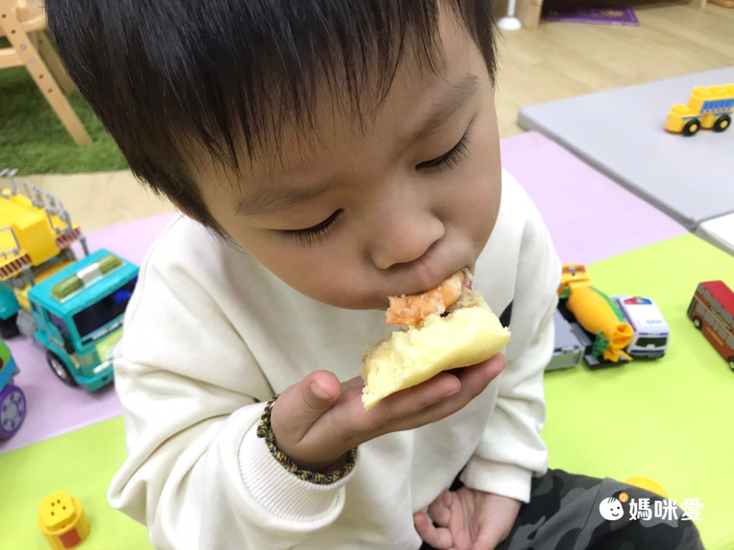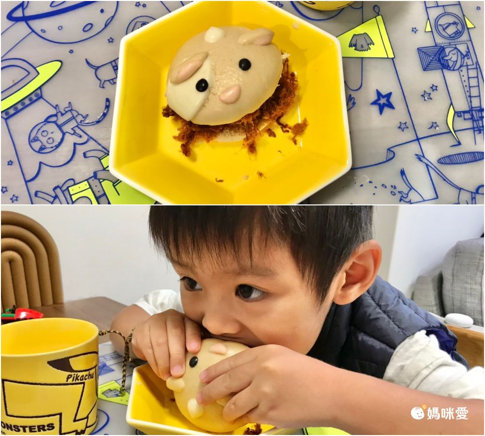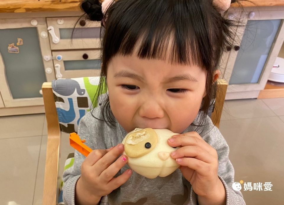 3歲的鬧鬧立刻被動物刈包吸引了,一小口一小口捏食,完全沈浸在自己的世界呀XDD