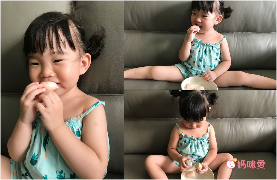 2歲多的小鱈魚吃得超開心,整個人變得跟小饅頭一樣軟Q(媽媽不懂為何要劈腿,但是很開心的樣子!)