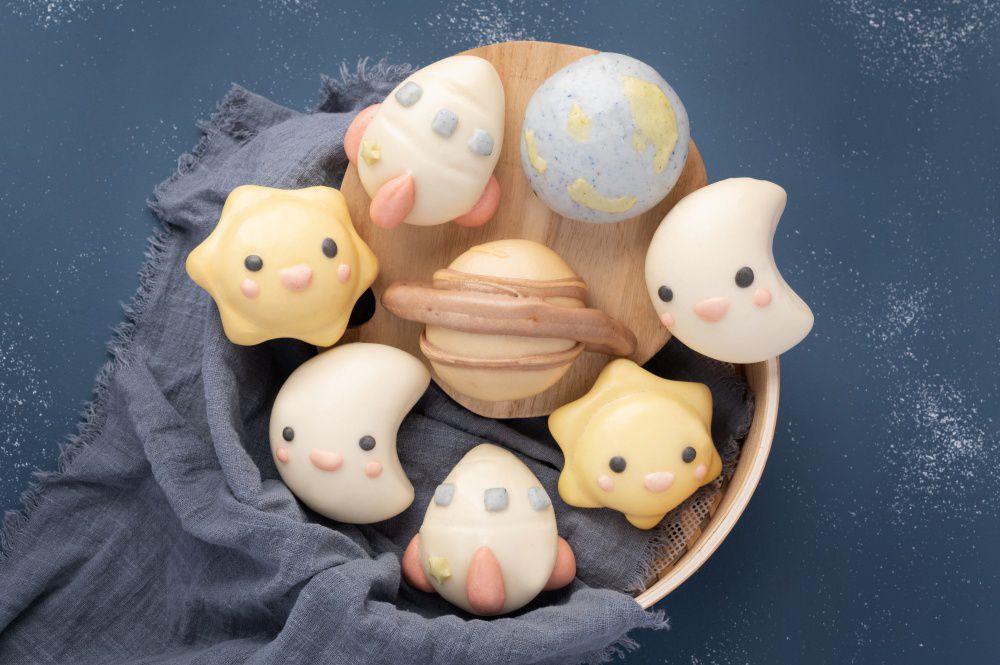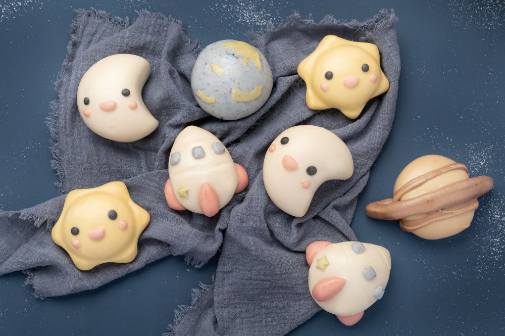 相信許多小朋友都對宇宙、太空很有興趣,老田推出宇宙可愛造型饅頭,除了有太陽月亮地球,還有火箭和土星環喔!