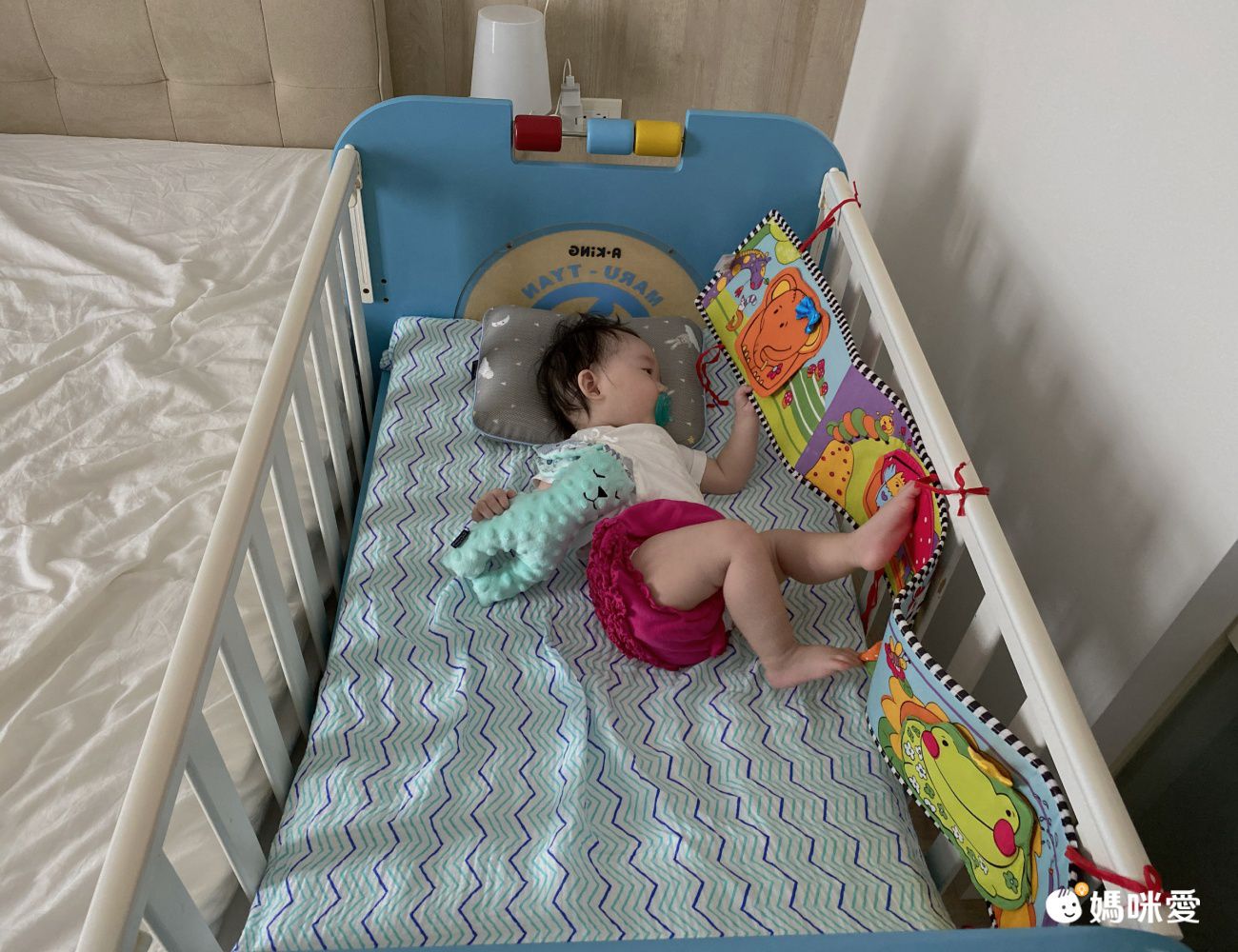 另外一位被毯比較厚,所以很適合拿來當遊戲墊&野餐墊,在遊戲墊上面簡單放置一些刺激五感的玩具,讓寶寶自己探索玩樂;媽媽可以偷閒一下~外出當野餐墊也很方便哦。