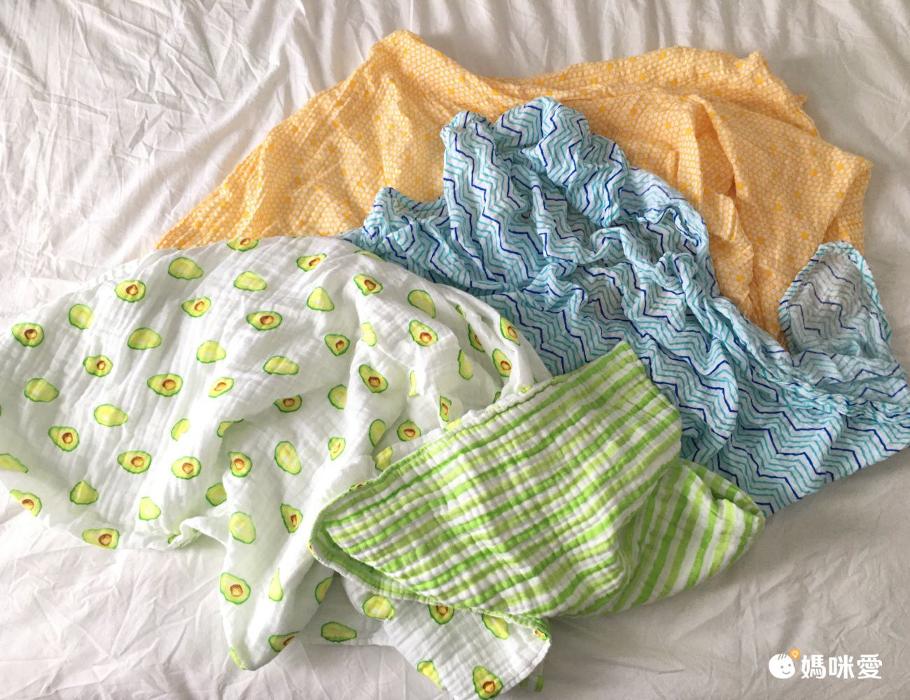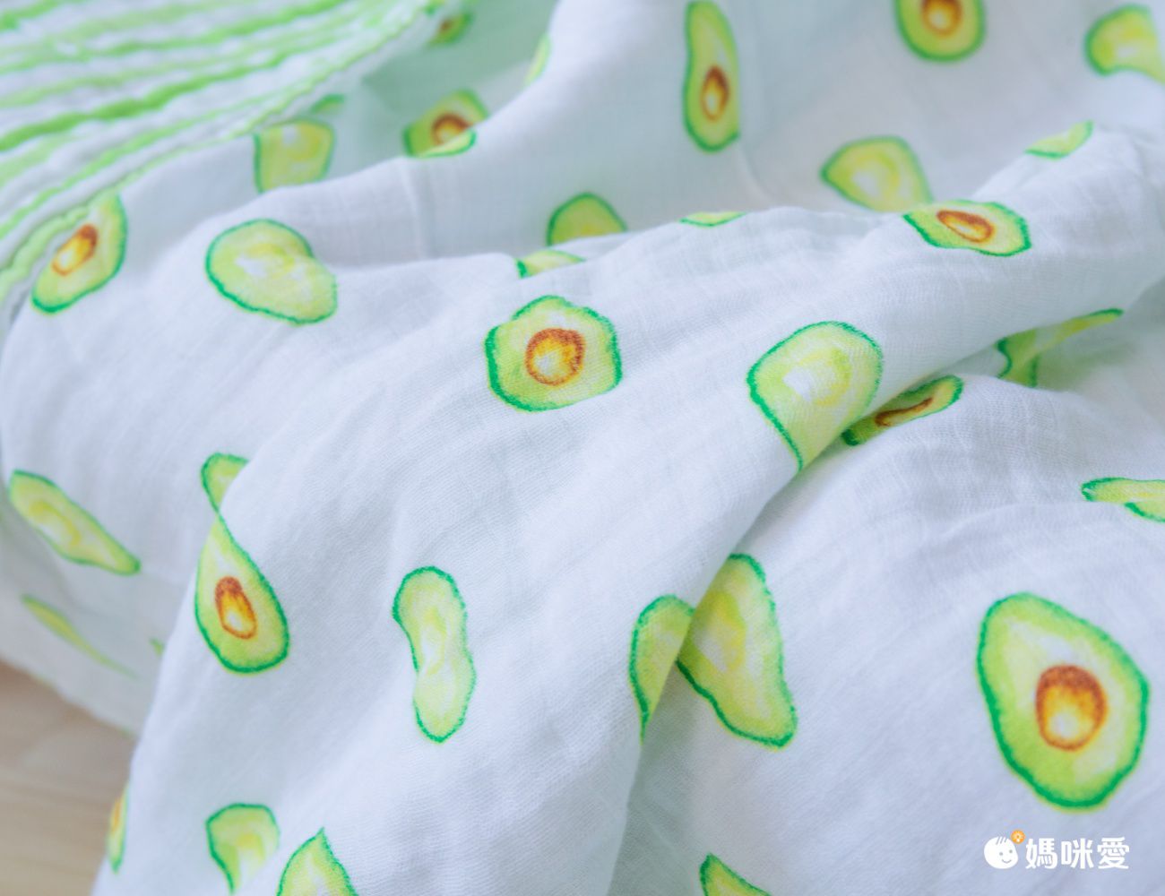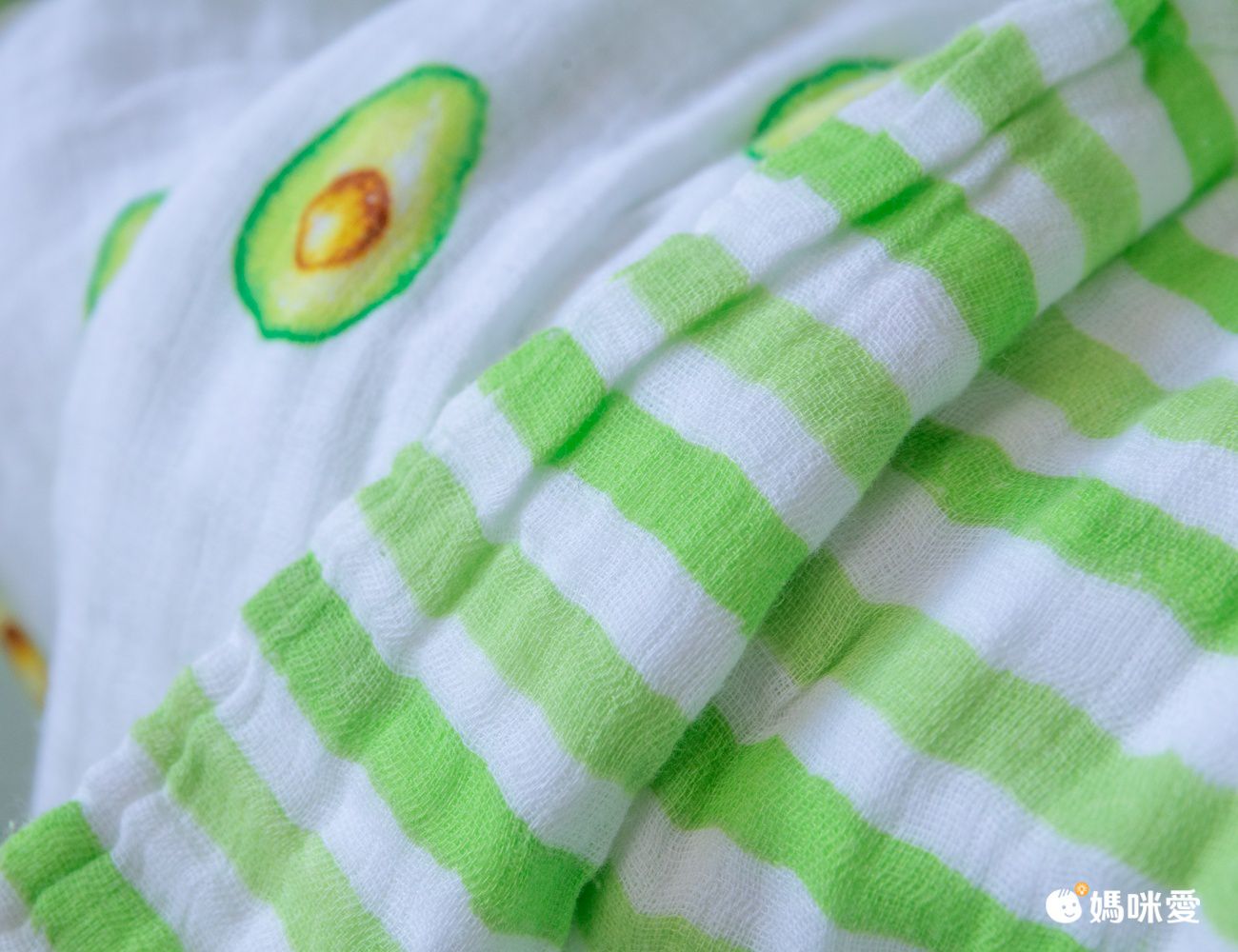 這次還有試用四層紗雙面蓋毯,市面上很少見,而且媽媽我最喜歡可愛的手繪酪梨圖案跟雙面用設計,四層紗沒有像六層紗厚度那麼厚,我自己覺得實用性反而比較高。買一條2姐妹都能用~~