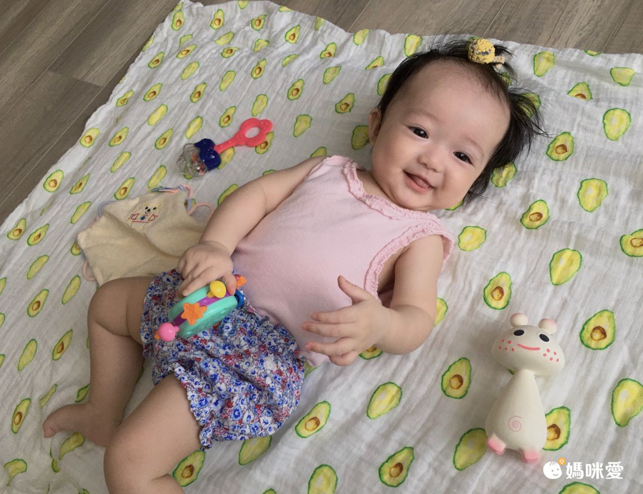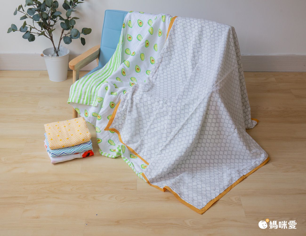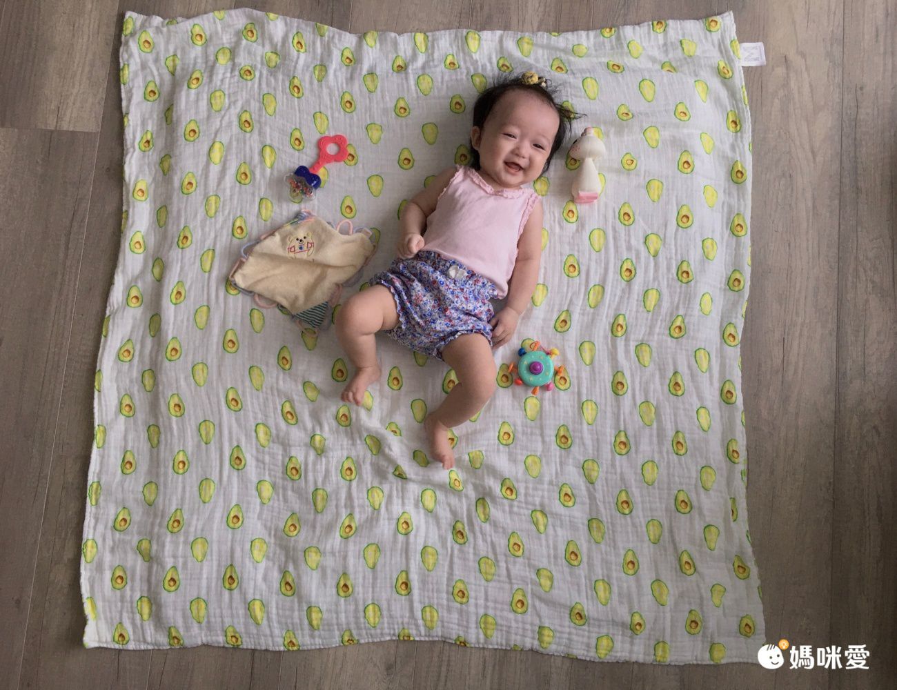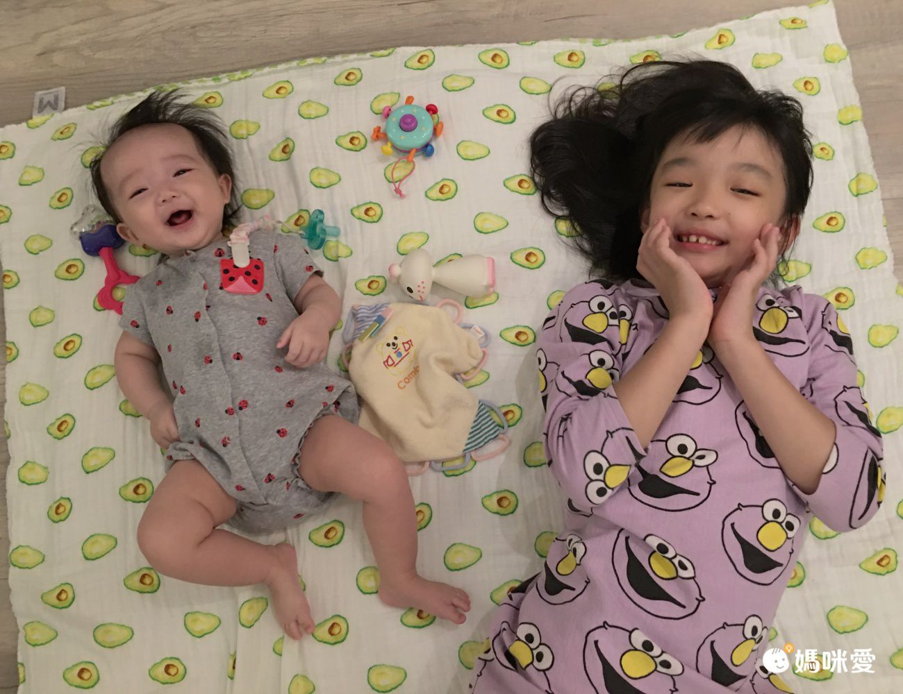 這次還有試用四層紗雙面蓋毯,市面上很少見,而且媽媽我最喜歡可愛的手繪酪梨圖案跟雙面用設計,四層紗沒有像六層紗厚度那麼厚,我自己覺得實用性反而比較高。買一條2姐妹都能用~~