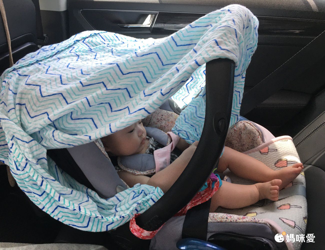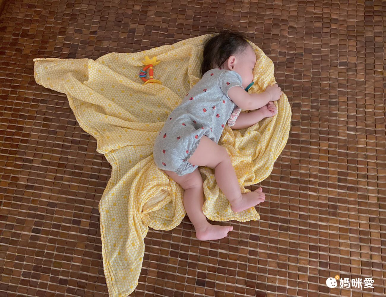 回南部婆家Mila睡不慣涼席的顆粒感,鋪上Malabar baby 包巾抓著馬上秒睡