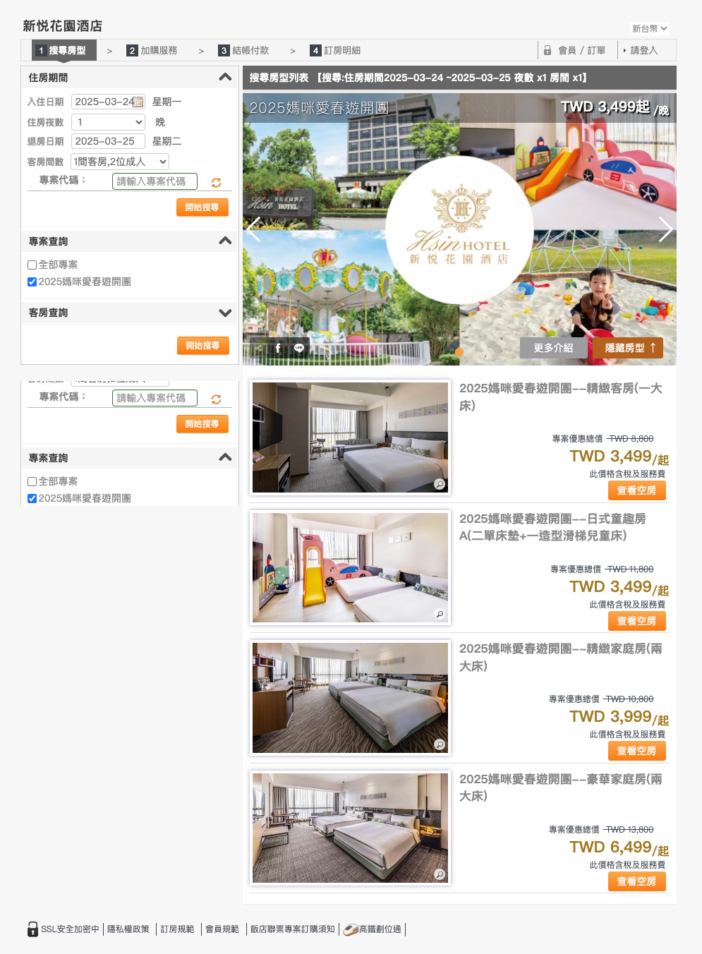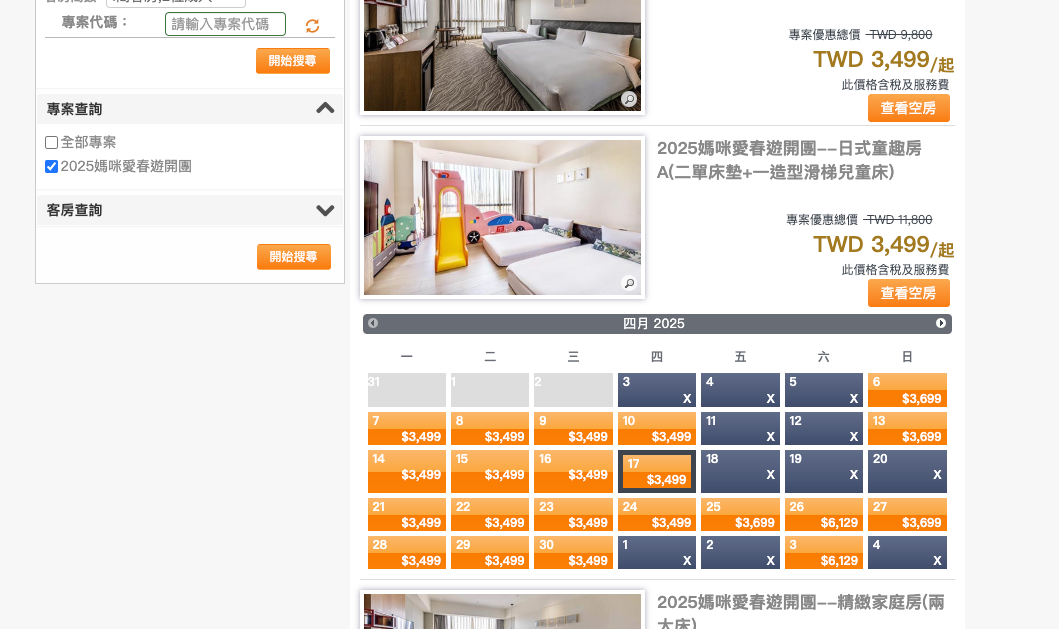 1. 點擊媽咪愛專案訂房頁面,選擇住房日期後,右側將出現該天方可訂房之房型(沒有出現的房型表示該天已售完,可切換不同天重新查詢試試看喔)