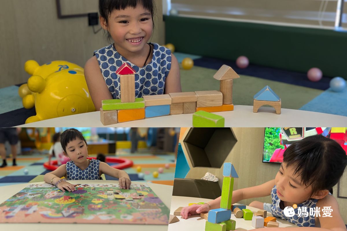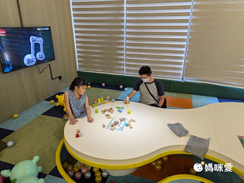 另一區還有可玩積木及拼圖的桌子,爸比表示大人也可以很舒服的把腳放到桌子底下,但我們覺得應該是他矮的緣故,如果是180的爸爸可能沒有他那麼舒服吧
