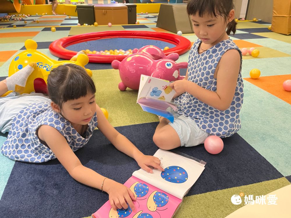 帶著圻兄弟前往三樓「小菁英俱樂部」,也就是孩子們最愛的遊戲室。透過不同顏色地毯拼接而成的地板,讓整個遊戲室顯得繽紛有趣,桌面上擺著童書、小積木等靜態活動,也有小朋友最愛的球池及體能攀爬區,阿圻跟阿弟就在這裡消耗了不少體力。