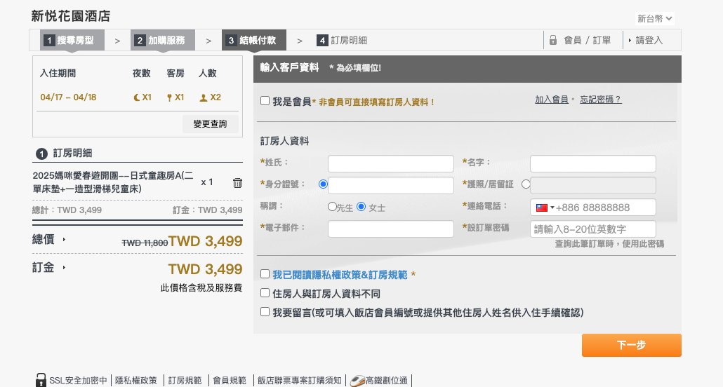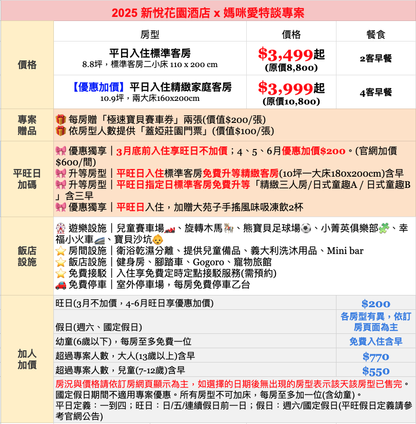 註:全館無加床/併床服務,如超出房型入住人數,每房限加1位(含幼童) 。加人加價:大人每晚NT$770/位, 兒童每晚NT$550/位,含早 、住宿及館內部分設施免費使用,但無提供加床服務。6歲以下幼童不佔床可免費入住。