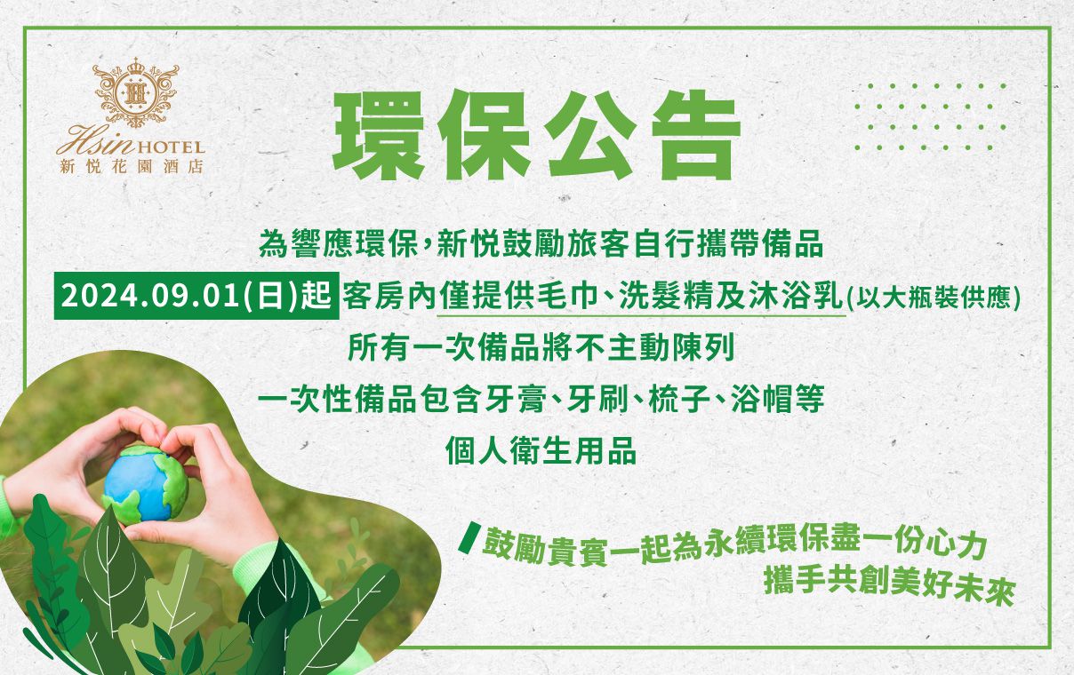 為響應環保,自2024/09/01起,客房內僅提供毛巾、洗髮精和沐浴乳。其他一次性備品(牙膏、牙刷、梳子、浴帽等)將不再提供。