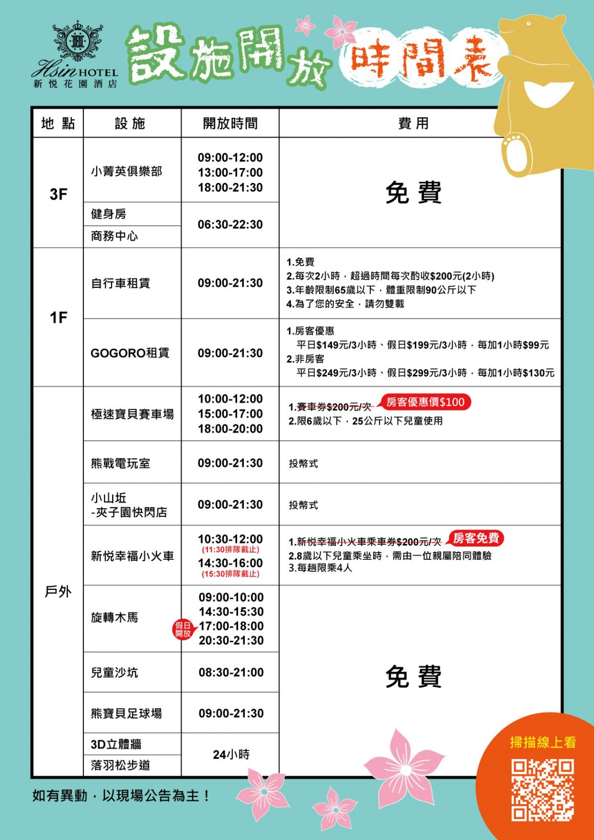 飯店提供免費接駁服務,分為市區專線來往於新悅花園酒店-檜意森活村-文化路夜市-嘉義火車站,包含了多個熱門景點、或是高鐵專線行駛高鐵與飯店之間!詳細時刻表與停靠點請洽飯店官網(點我前往)。