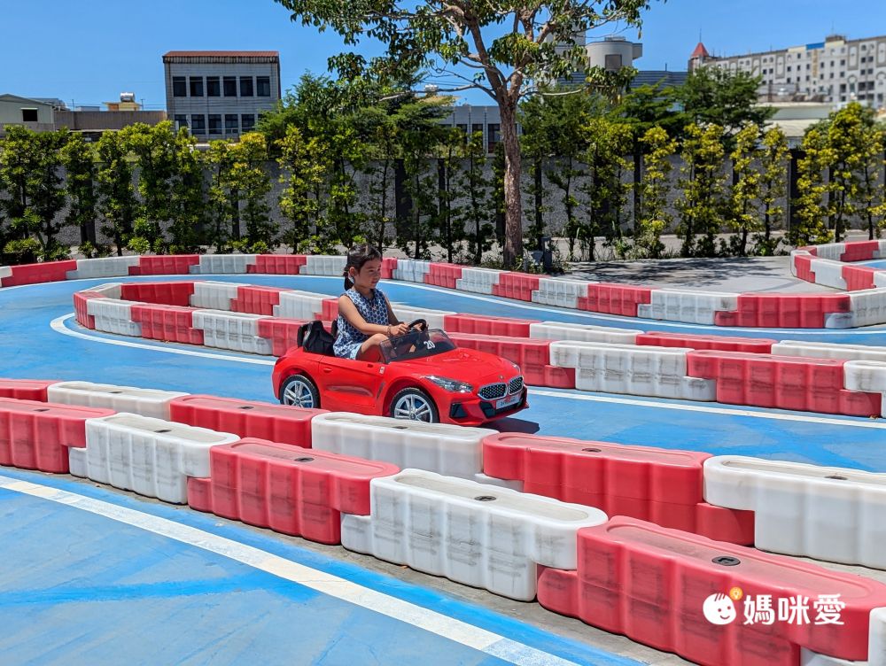 叮噹媽也帶了兩位姐妹來體驗!車道像是卡丁車的賽道,有點複雜又彎彎曲曲的,對叮噹來說很有意思,場上有播放音樂,有增加跑車的氣氛~