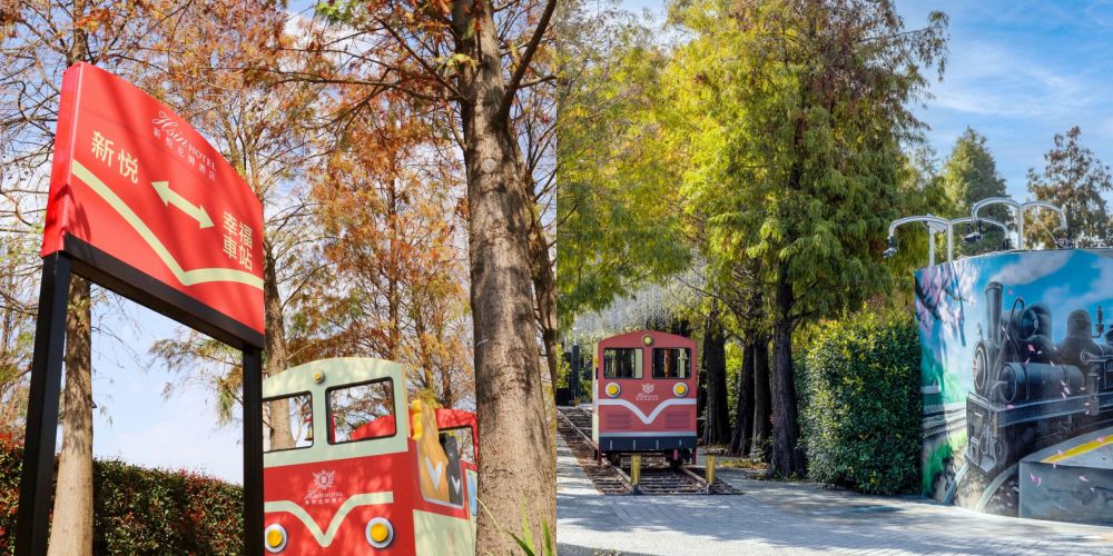 酒店外還有一處鐵道園區,牽著我的前世情人,漫步被落羽松包圍的鐵軌中好不愜意~新悦幸福小火車是打造一比一仿阿里山高山鐵路的森鐵小火車,來一趟熊熊家族落羽松鐵道之旅,不用到阿里山也能感受到小火車的迷人魅力。