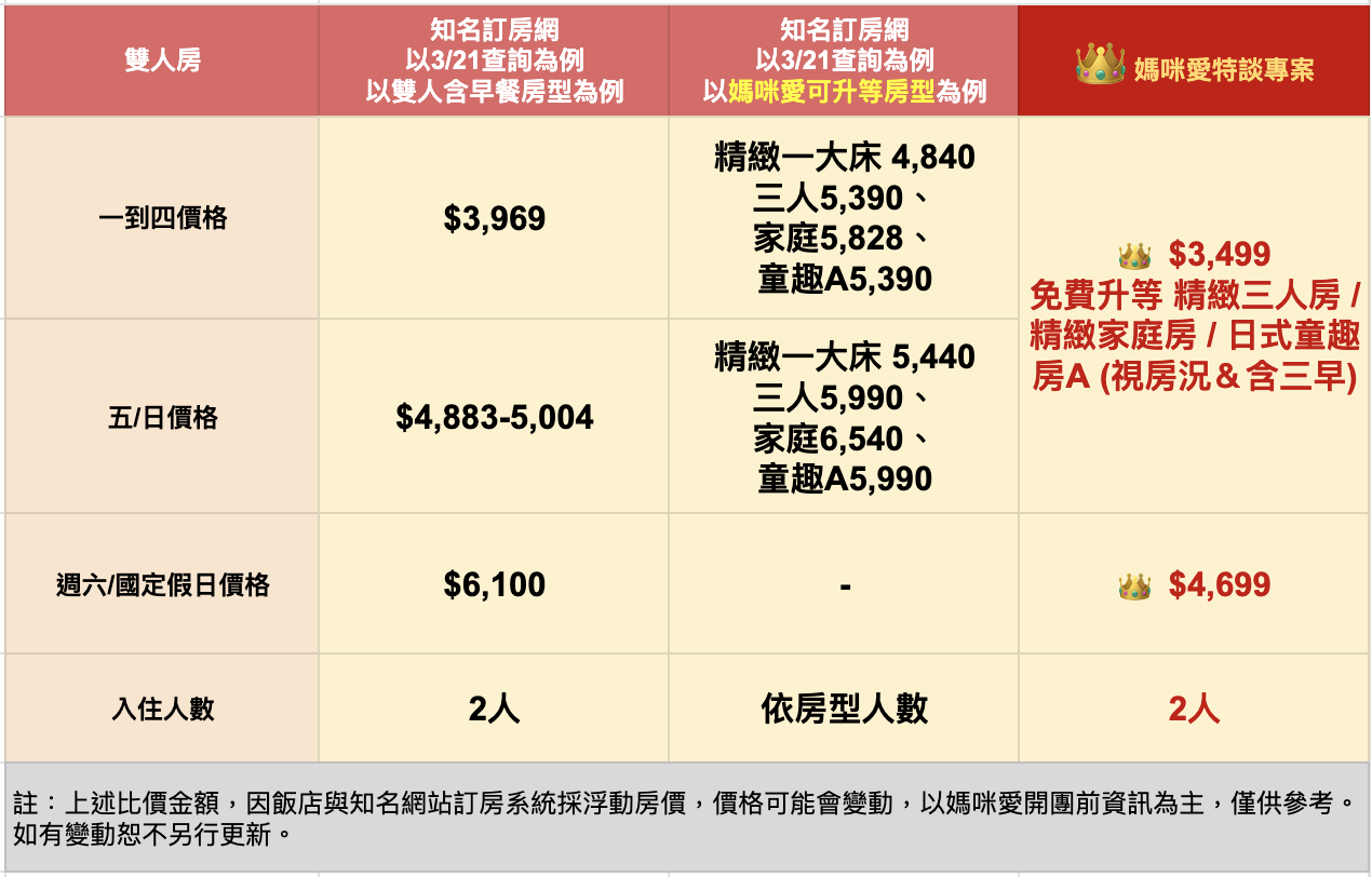註:優惠獨享|3月底前入住享旺日不加價;4、5、6月優惠加價$200。(官網加價$600/間)