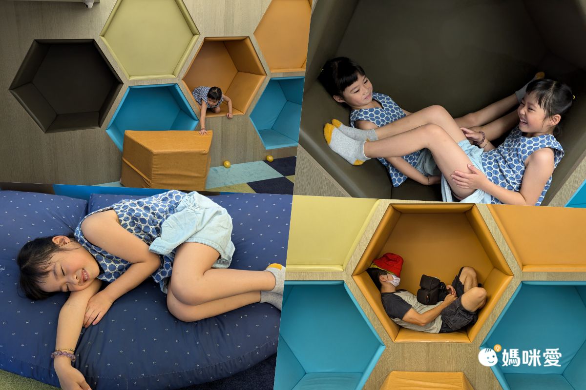 遊戲室到處都有座位可休息,甚至爸比還在牆上找到蜂巢格子可小瞇一下(笑