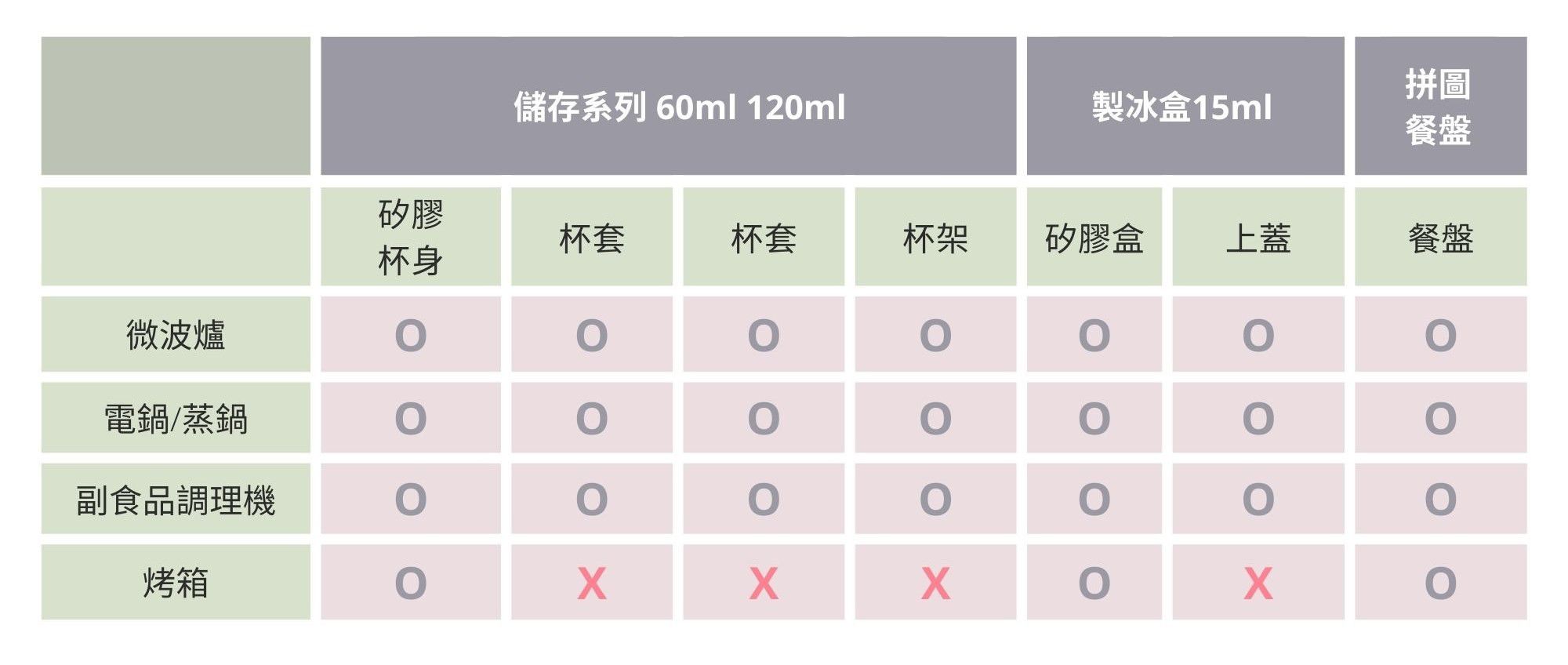 用儲存杯加熱副食品時,可使用微波爐或電鍋,甚至還能用烤箱加熱,當作烤模使用!附上加熱使用說明~使用烤箱加熱時,矽膠部分可進烤箱,但溫度不可超過220°C,務必取下上蓋、杯套跟杯架喔
