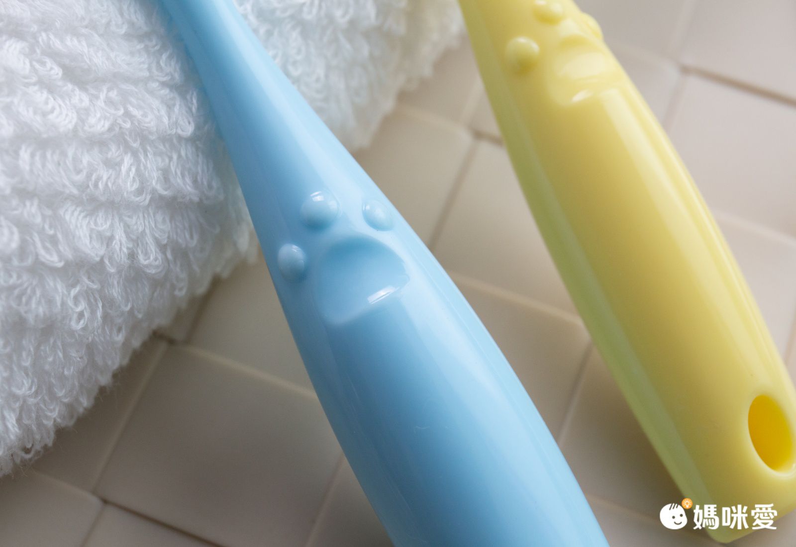 用小手握著牙刷,她看到牙刷上的小貓腳印非常好奇,我告訴她可以用大姆指去壓著後,紜紜可以非常準確的把大姆指壓在上面,明確的指示非常聰明!讓孩子知道正確拿牙刷的方式,握著圓圓的刷柄,小朋友也可以隨心的左右翻轉手腕,另外這款牙刷讓慣用左手的小朋友也能順手使用,她摸著那又細又軟的刷頭,一股腦的就往自己的臉上先刷,還直說也太舒服了吧~