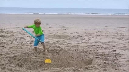 仔細觀察沙鏟的設計,鋸齒撞的部分可以用來挖洞,鑿出護城河。有一部分的孔洞較少,是用來舀沙,聚集沙堆。孔洞較多的部分 Lucas 喜歡拿來當沙漏玩,編媽也會帶著他一起過濾沙子,找看看有沒有貝殼藏在裡面,是個可以創造驚喜感的玩法。