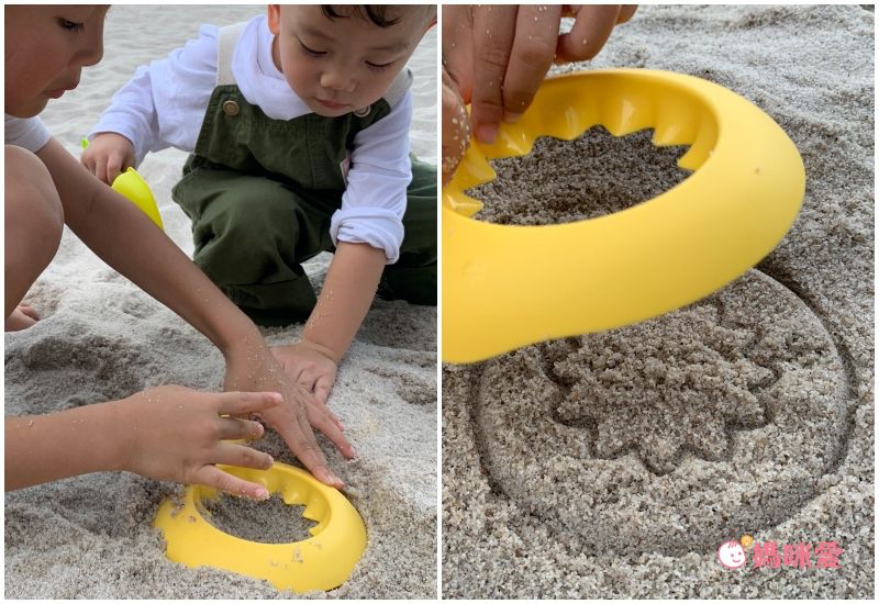 非常好塑形,用微濕的沙就可以很容易壓出可愛的圖案有,如果在不能用水的沙坑裡也可以用來鏟沙,cp值真的很高