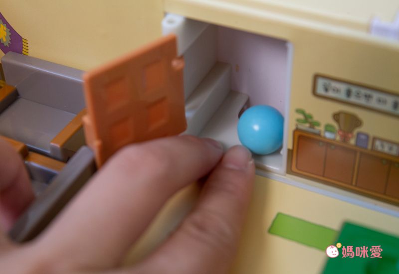 警察局的玩法是把球從二樓的大門丟進去,球會隨機跑到一樓的的其中一扇門前,孩子要像偵探一樣,透過聲音來推理打開哪一扇門才能找到球,可以培養專注力和敏銳的觀察力。