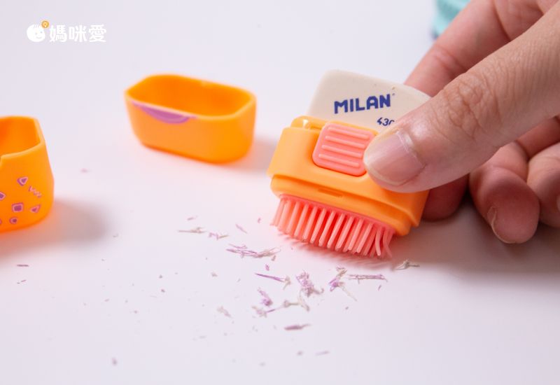 MILAN 的橡皮擦下方的蓋子打開後,有削鉛筆跟橡皮擦屑刷子兩種用途,上方的改子可以拿來當裝橡皮擦屑跟鉛筆屑的容器,方便孩子丟棄。