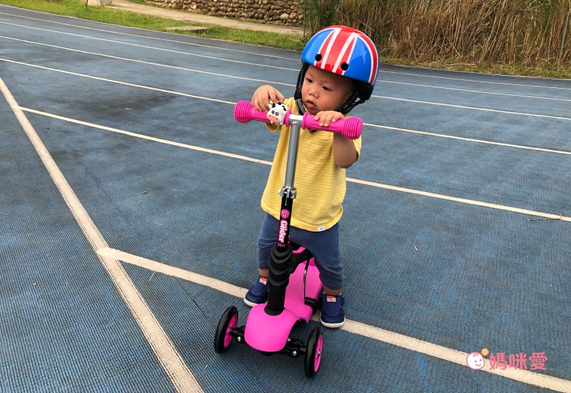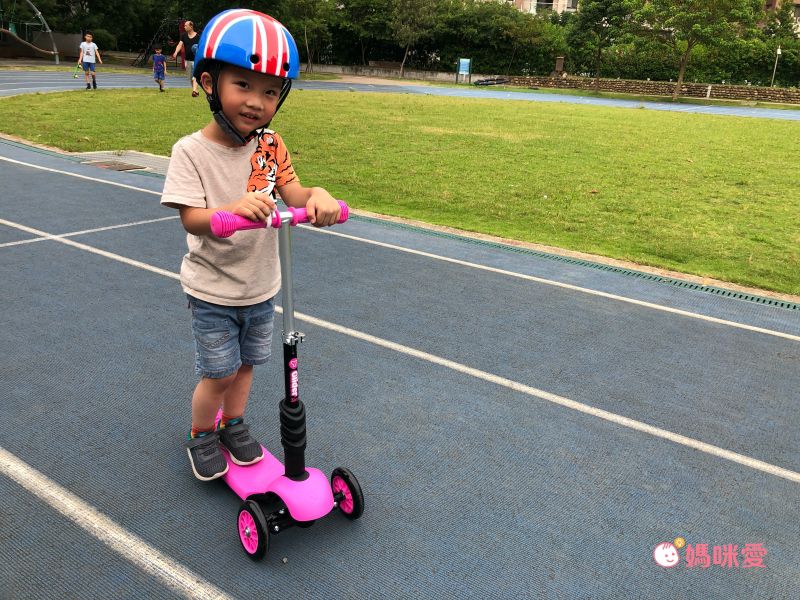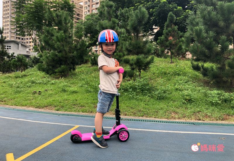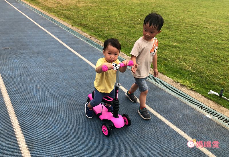 切換成滑板車模式,讓四歲的哥哥咖哩騎車,咖哩之前騎朋友的滑板車時,因為車體不穩而摔跤,之後就不太敢輕易嘗試滑板車,但試騎了 Yvolution 之後發現不會晃,很有安全感,馬上有了信心和勇氣,連之前不敢挑戰的上下坡他也敢騎了!