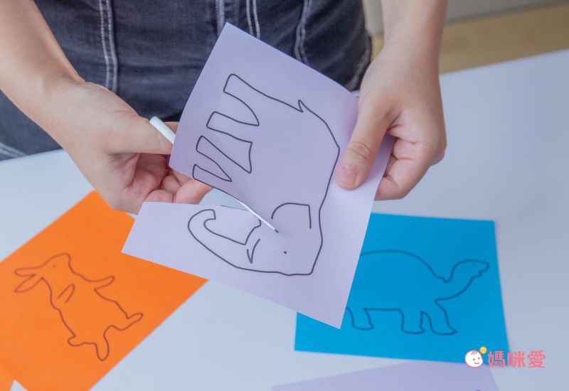 第二步-剪出動物圖案:從小紙張進階到大紙張,上面有可愛的動物圖案,孩子可以沿著線條慢慢剪出動物的輪廓,線條很粗孩子很好對準剪裁,剪好的圖案還能貼在卡片上當裝飾。