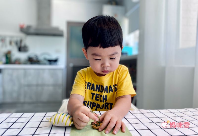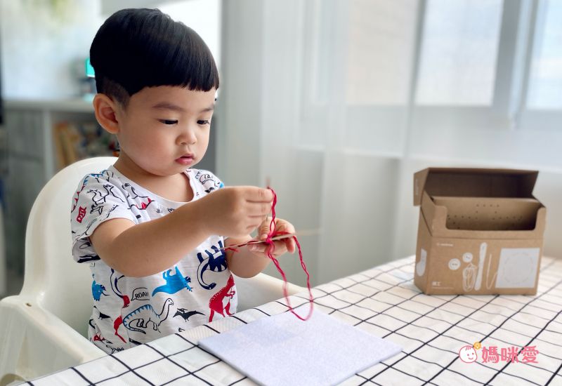 江口設計的教具為了讓孩子好上手,從長度到寬度設計都精心測量過。縫工盒裡的針,除了尖端有安全設計,身形較粗,穿線孔也很大,搭配粗毛線,讓首次接觸針線的幼兒,也能輕鬆穿針引線 (使用時爸媽還是要陪同在旁更安心)。子惟自己把線穿過去也沒問題,雖然打結還是需要媽咪協助,但光是穿線這個步驟成功,子惟就開心了好久,小小的動作就能給孩子莫大的成就感。