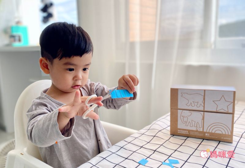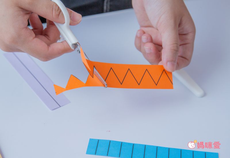 第一步-練習拿剪刀:先從長紙條開始剪起,特別設計的寬長紙張讓子惟容易捏握。一開始先用畫著直線的紙張,孩子只需要一刀剪下,反覆練習熟悉操作剪刀。