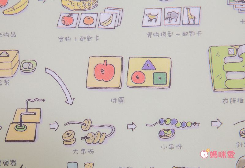 圖中清晰表現出依孩子能力的活動進展,從最簡易的套環,到不同難度的套法和變化的串珠,增進孩子的手眼協調能力。