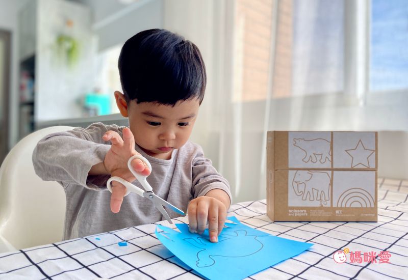 剪刀是專為孩子設計的版型,手穿過剪刀的洞設計得剛剛好,不會太大容易手滑,也不會太小手卡住,即使是剛接觸剪紙的子惟也能輕易上手!