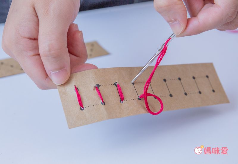 第二步-練習「縫」的技巧:引導孩子把紙張上的黑點點連結起來,針插進去後,把紙翻面從背面把針拉出來,再重新把針從同一面插入紙張,從另一面拉出。光是這個簡單的動作,就足以讓小小孩玩上一上午。