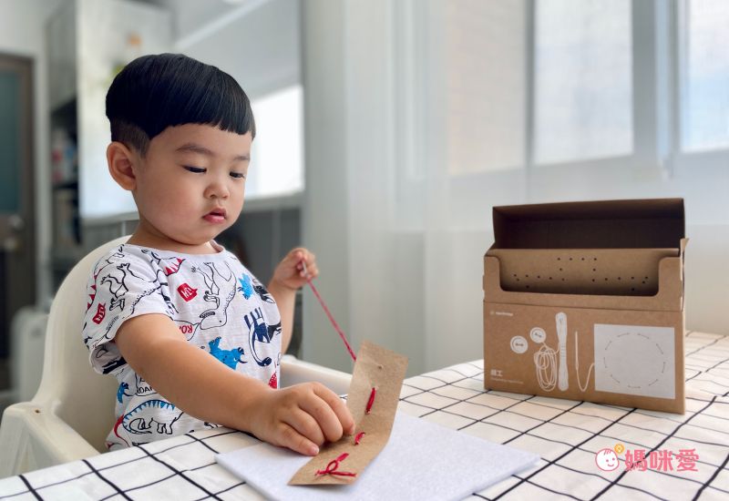蒙特梭利教育法鼓勵讓孩子動手做,縫工盒讓子惟有機會練習使用針線,子惟體驗縫工盒才幾天,小手肌肉控制狀況就越來越好了!邊玩邊學習真的很讚。