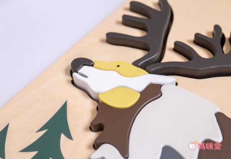 江口桑設計的原木動物拼圖,拼接方式也有別於傳統的拼圖,第一層原木背景,讓孩子先認識動物的樣子,掀開第二層則是將動物的原生自然環境,麋鹿就是森林,透過這樣的順序,讓孩子記下動物的樣子與居住生態,背後的理念相當用心。