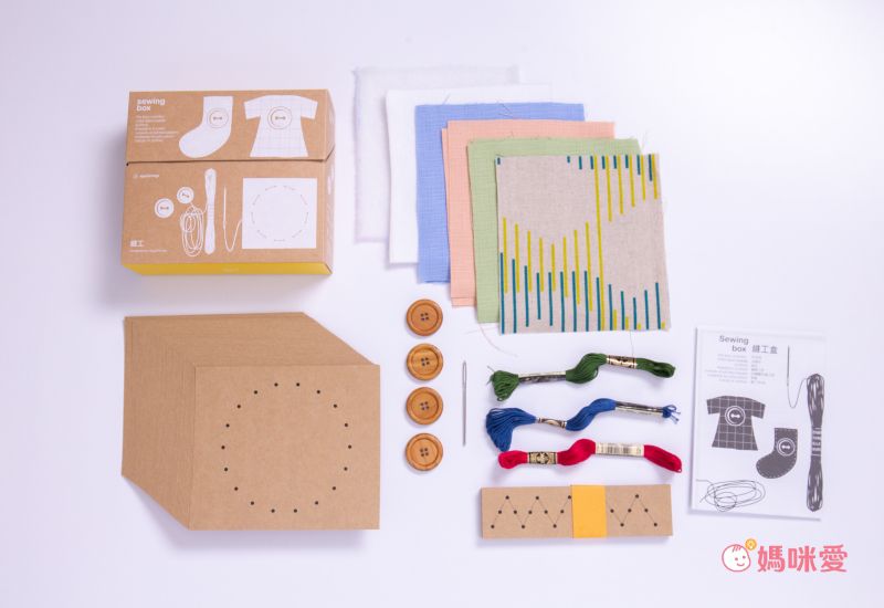 縫工盒內容物:棉布 / 鋪棉、毛線針 / 不織布刺工墊、繡線三色 / 木鈕扣、縫工紙 / 縫工布。尺寸: 16x5x14cm、重量: 340g。