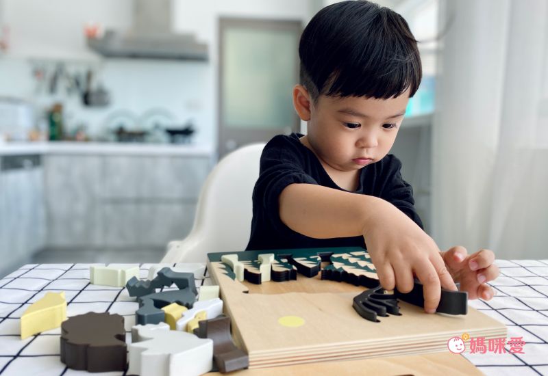 子惟很享受拼圖的樂趣,一片接著一片,慢慢地直到拼湊出圖形的全貌。在完成拼圖的剎那,孩子的喜悅是無法比擬的。