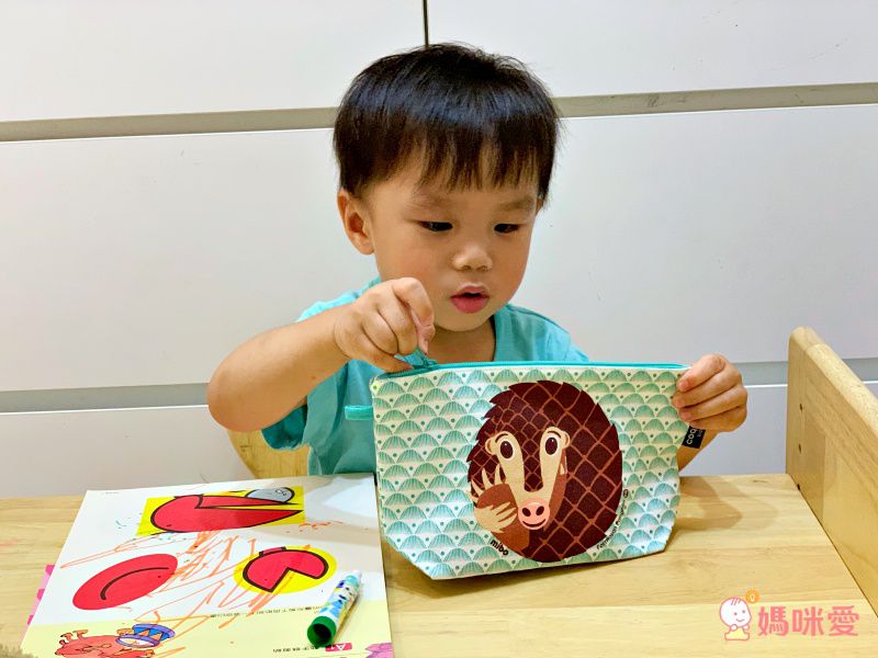 除了設計可愛之外,拉鍊設計好開啟也是一大特色,2歲的阿弟就可以輕鬆打開畫筆兒拿出自己想要的東西囉!